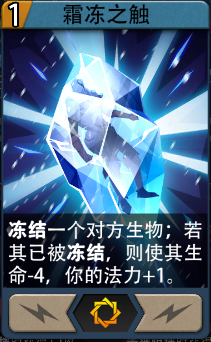 卡背效果:通过生物、魔法或装备卡抽牌时,有几率法力+1,并获得1张免消耗的[霜冻之触](每回合限1次)。