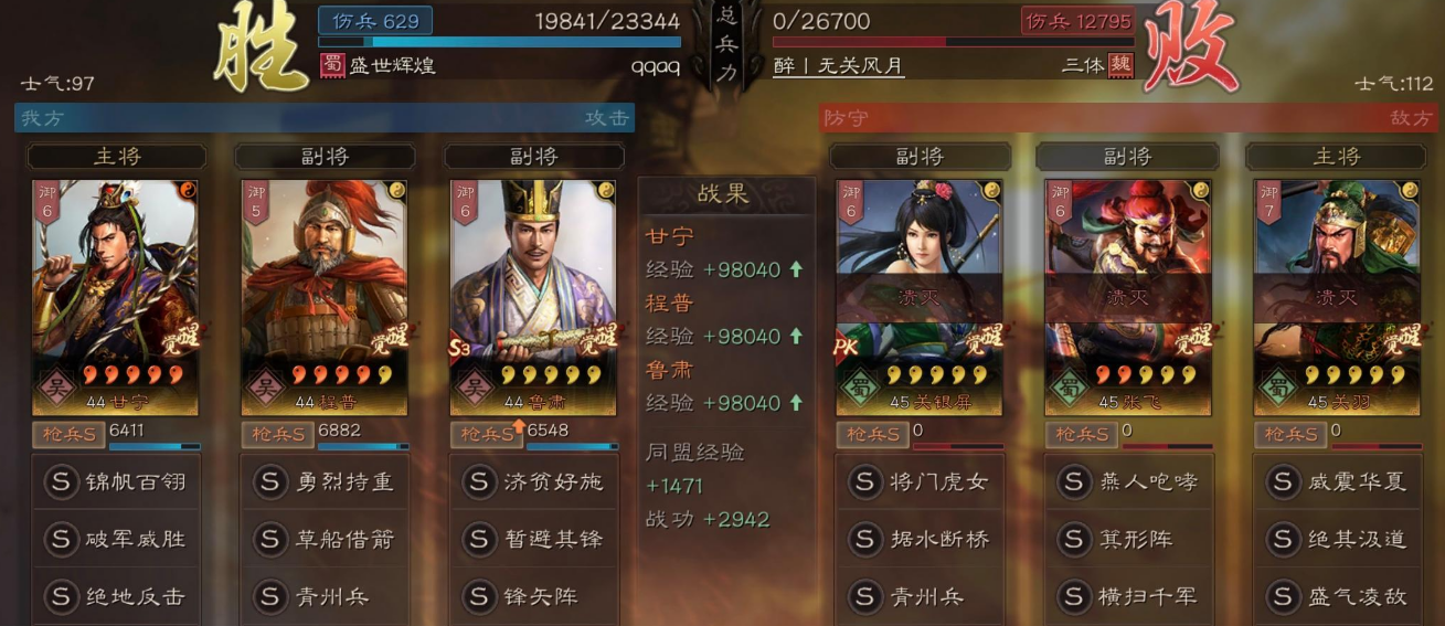 白板关关张基本上打不动这个队伍,基本甘宁触发绝地反击对面三个武将就全没了!