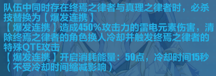 始源在与真理和终焉组队时大招替换为【爆发连携】,获得全新技能效果。连携大招同样是始源的主要辅助手段。