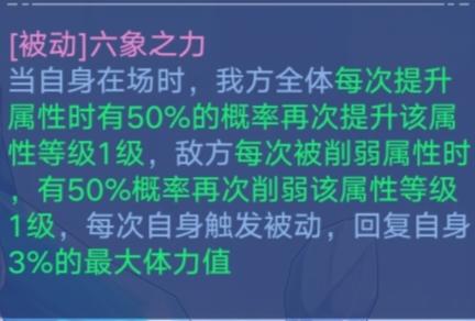 被动可以给我方全体加双抗和开盾,很不错的被动,但是要注意,被动的加成只有在【六象之力】持续期间才会生效。