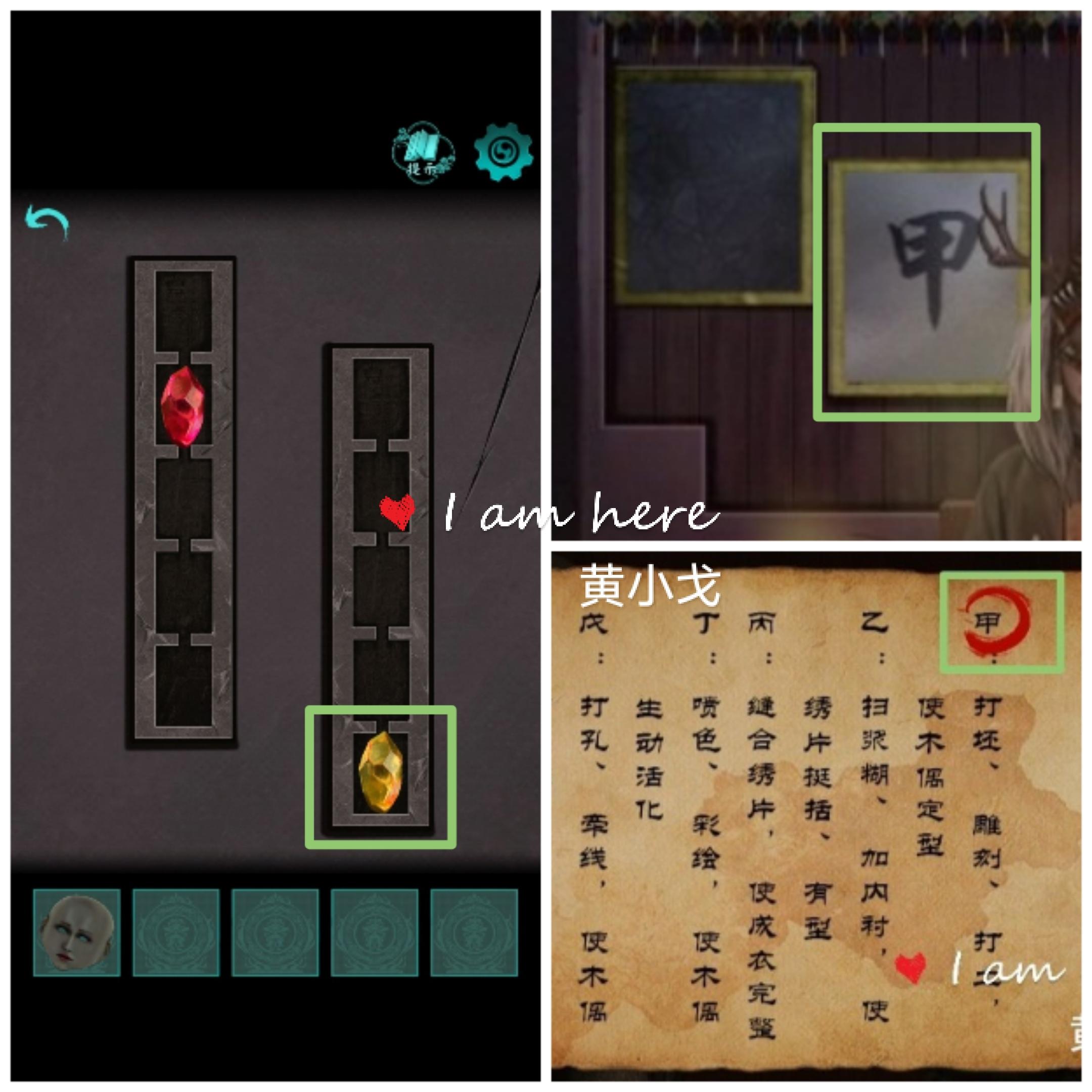 21.左边墙上的黄色宝石机关,根据(暗门)柜子内的卷轴信息(圈甲),调整宝石位置至第一格