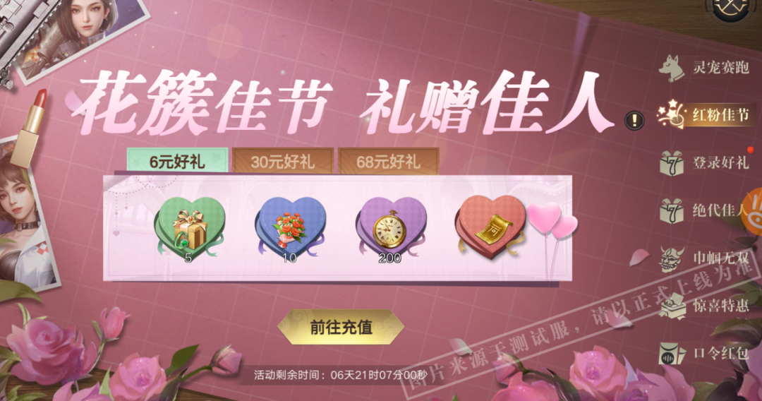 (例:充值金额68元,即可领取6元、30元以及68元好礼)