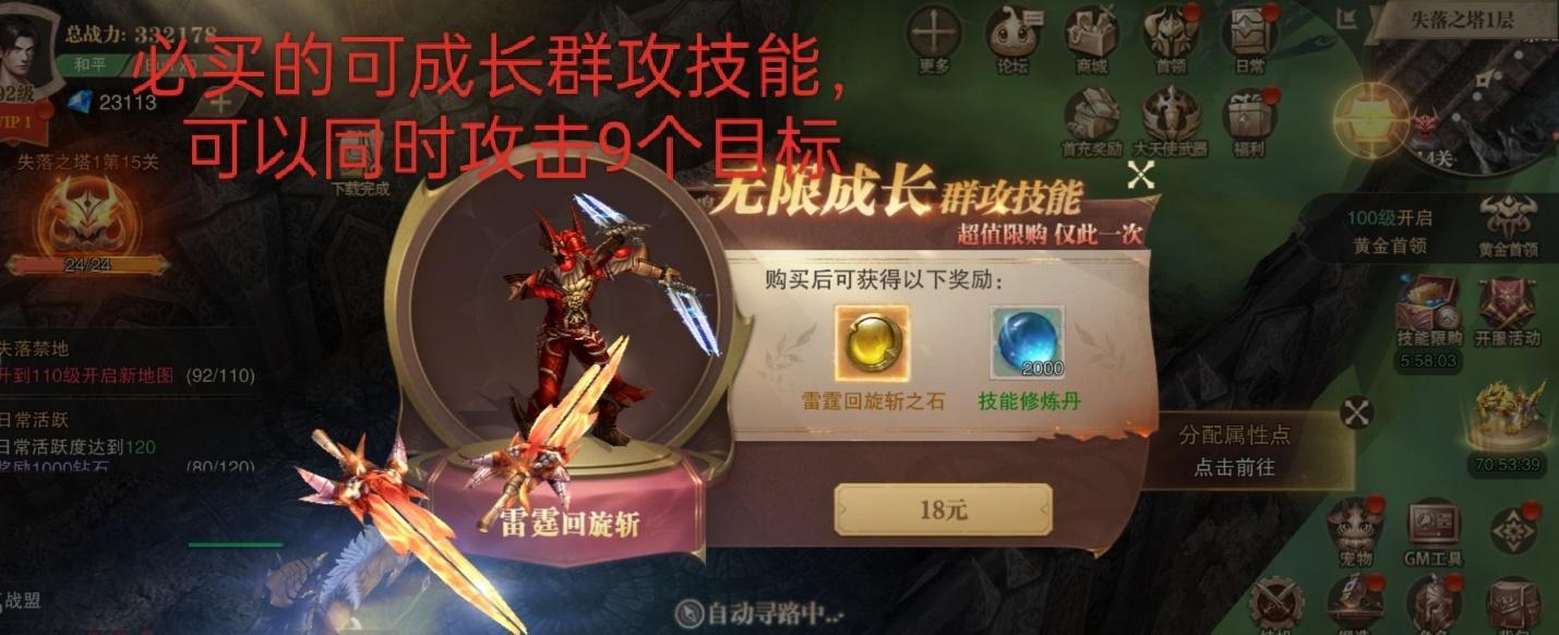 升级跟着任务跑图的时候可以拿下首充奖励。把右侧各种签到奖励都领一下,先把技能PVE调整成只带可成长的群攻技能,这样刷怪会比较快。当任务提示刷血色的时候可以先不去,有时间的把等级提升到50以后再去这样经验会多。50级左右一般到冰风谷,这时间推关的同时会很闲,可以把本文末的兑换码去兑换掉。