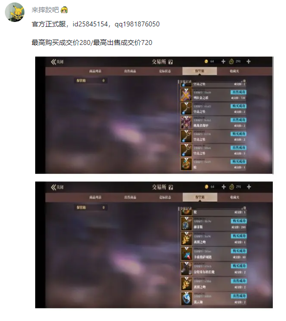 ⭐回复格式:所在区服+ID(背包-人物旁的8位数字)+qq+单次购买成功/出售成功最高成交价+对应交易记录截图