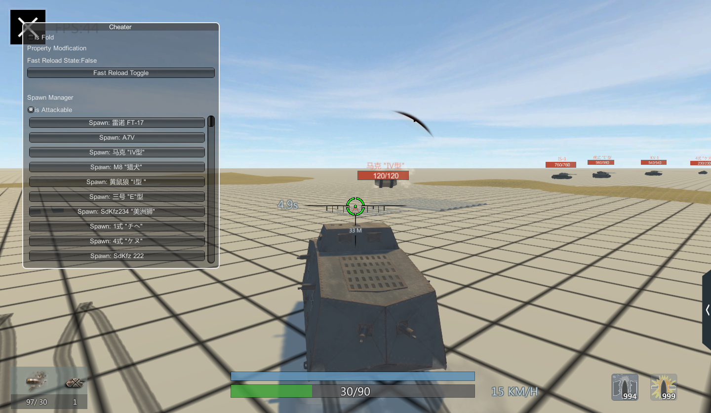 马克IV型,装备两门57mm火炮(置于车体两侧),只有一种穿甲弹,穿深29,伤害30,装填时间4.2秒,最大俯角7度,最大仰角20度,炮塔转速18度每秒,炮管转速9度每秒。