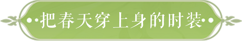 说到春天总是唯美浪漫的,在冬日的枯寂和乏味过后,春日的色彩就格外令人心动!在踏青途中,入目的春茶、山樱、海棠、紫露,还有满眼葱郁的绿意,都让人心旷神怡,所以也将这些颜色铺在了新时装上,穿上就能把春天留在身边。