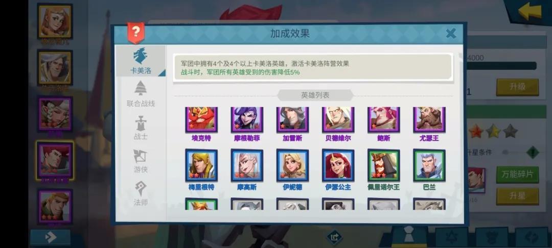 卡美洛:军团中有4个及以上卡美洛英雄,激活卡美洛阵营效果,战斗时,军团所有英雄受到的伤害降低5%