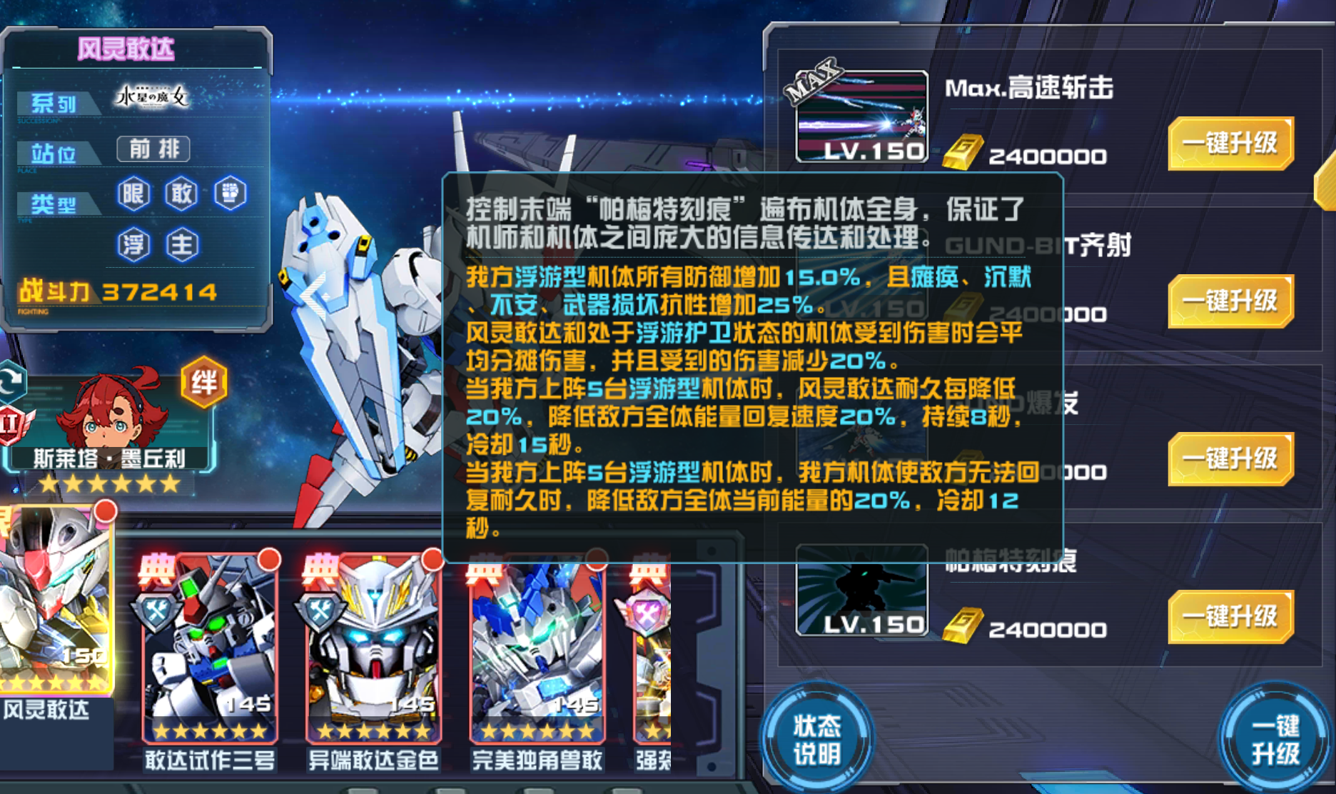 当我方上阵5台浮游型机体时,风灵敢达耐久每降低20%,降低敌方全体能量回复速度20%,持续8秒,冷却15秒。