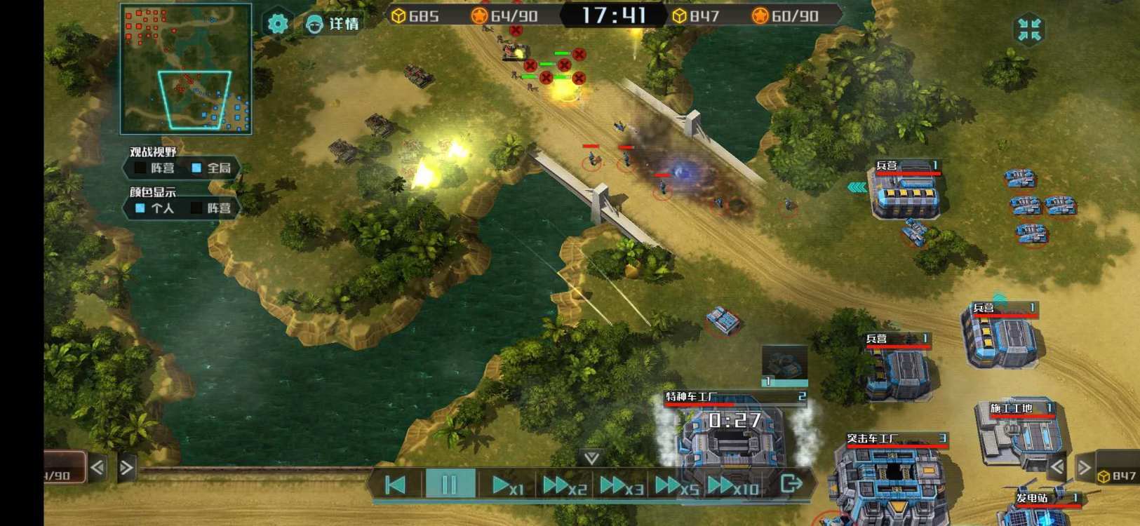 利用自己的小兵和直升机去前线侦察一下对手出了什么样的单位。在本局内可以看出对方出了蓝军的大杀器宙斯—具有强大火力,所以我们需要多出一些单位来应对他。