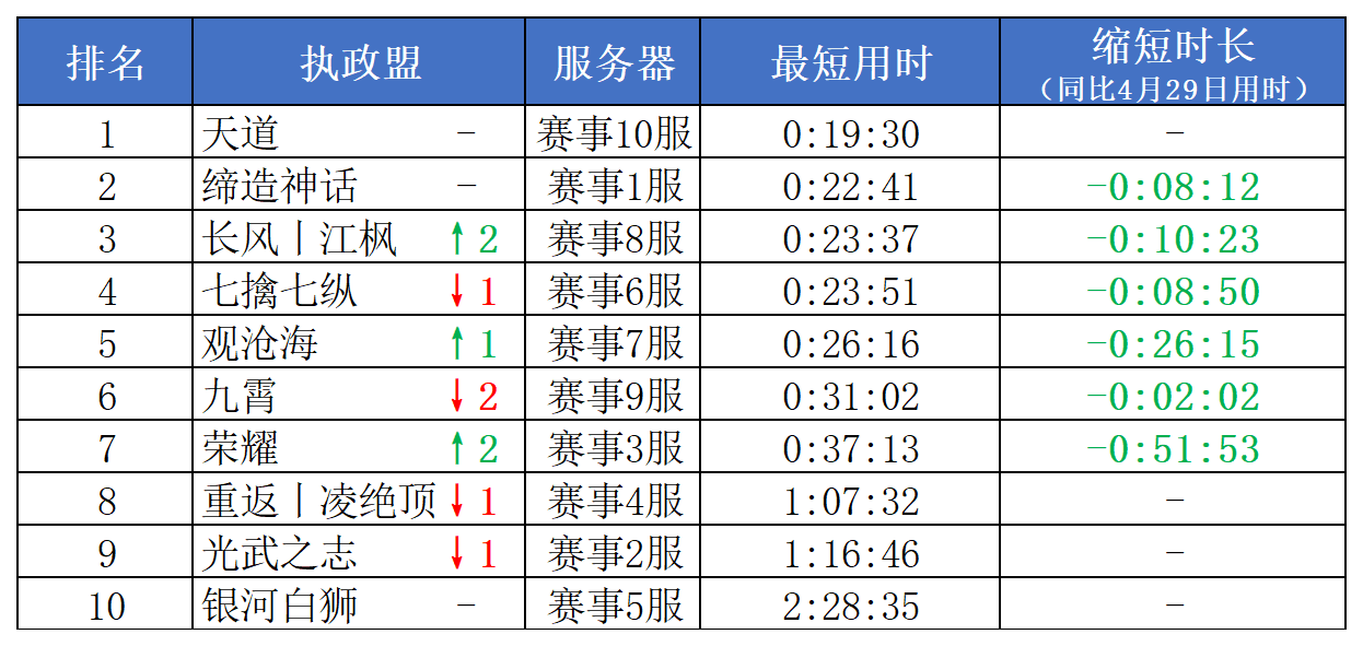 同上周的排行榜相比,赛事3服的【长风丨江枫】自洛阳竞速以来首次进入前三,赛事10服的【天道】和赛事1服【缔造神话】依旧稳居一二位。【缔造神话】再次刷新了赛事1服的最佳成绩,距离19分30秒还有不到3分钟的成绩差,向第一名的【天道】发起了有力冲锋。