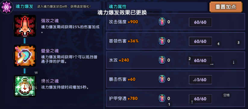 对于魂点不够用的同学,在满足穿透和暴击的前提下,各项属性平均分配点取,或者可根据自己面板来自己调整加点