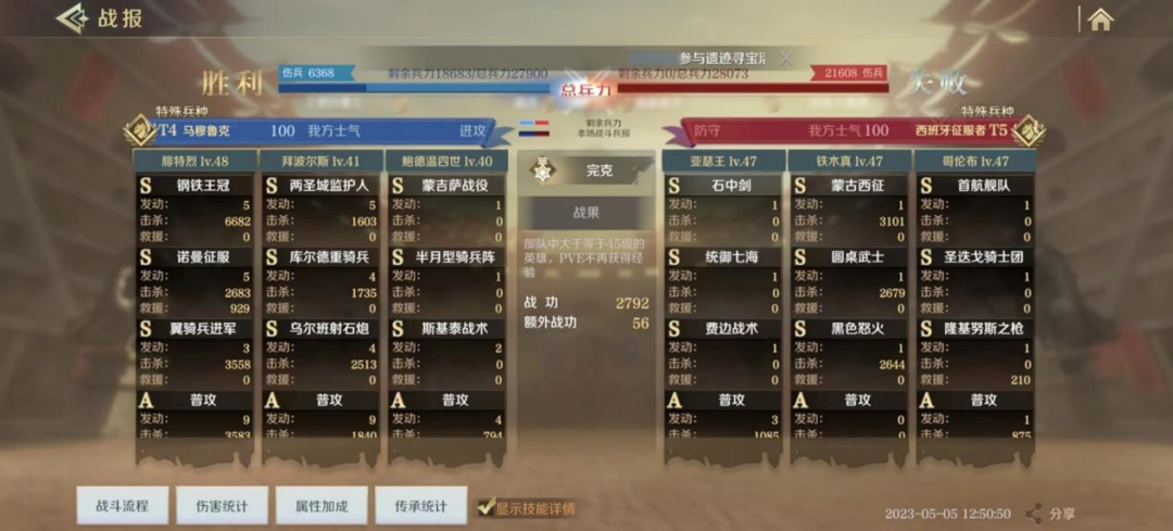 技能方面,天命拜波尔斯主要携带能够提供高额力量加成的【库尔德重骑兵】和【乌尔班射石炮】,而麻风王则携带能够提供迅捷和连击的【半月型骑兵阵】和提高整体爆发能力的【斯基泰战术】。