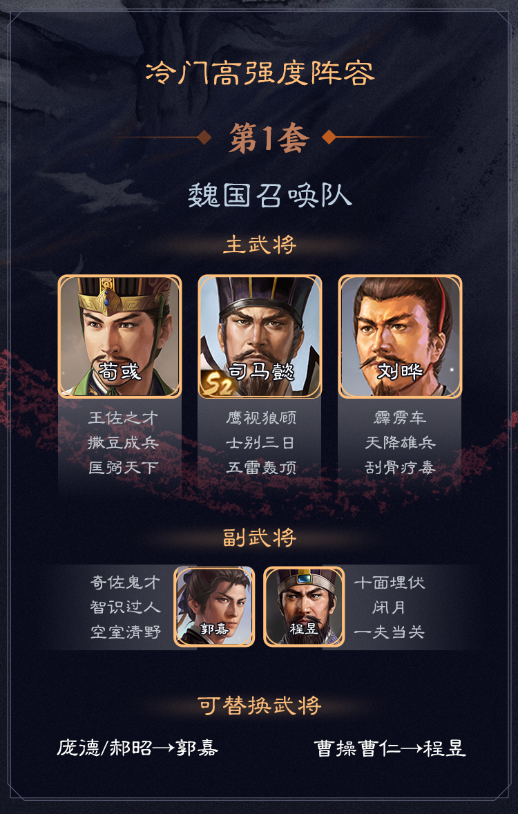 人气主播@解说方程 点评:核心是荀彧,郭嘉和司马懿,舍弃了常规的郝昭选择刘晔,在一定程度上加强了aoe输出能力,整体思路是由司马懿、程昱担当前排,郭嘉为核心输出,刘晔提供aoe,在面对当前版本大火的毒召唤,有不俗的表现。但短板也很明显,后排较多一旦被对方阵容突进,很难有反制手段,在有单双桥的地图中会比较有优势。
