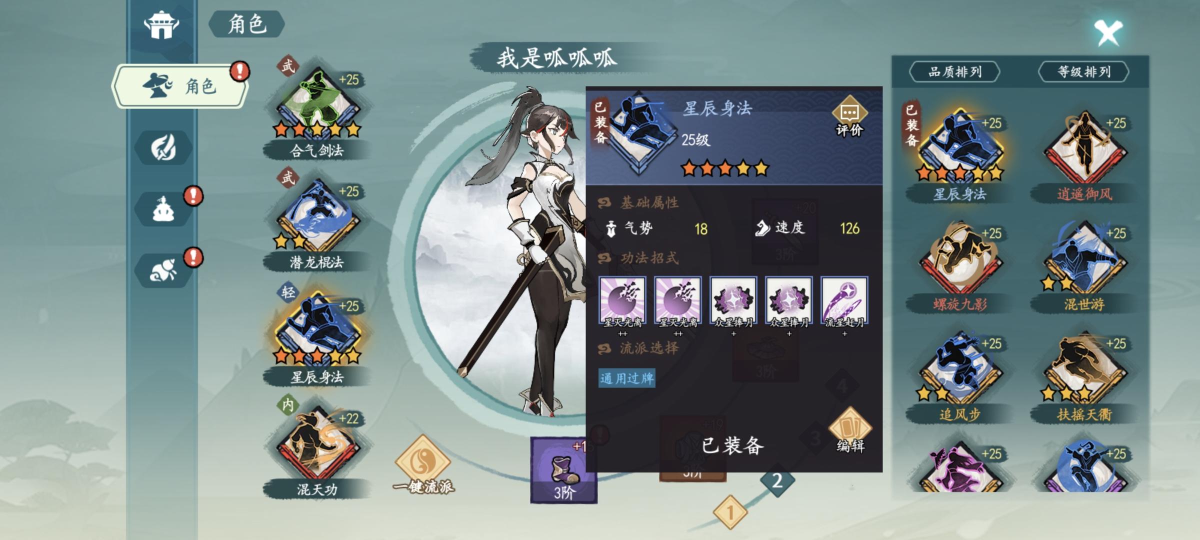 第二个成本低套路,聚气流但是聚气剑,这套聚气流,开荒强度高但是后续上限不如快剑,棍法潜龙棍必备,加气加臂力还有过牌,你可以当做聚气流的第二本内功,后续聚气剑可以换高星伏魔杖法,聚气流身法最推荐星辰身法其他不考虑,内功也是只推荐混天功,下下位沧山水云决,因为这两个内功给气上限,这是聚气核心,而且混天功开局固有两点气上限