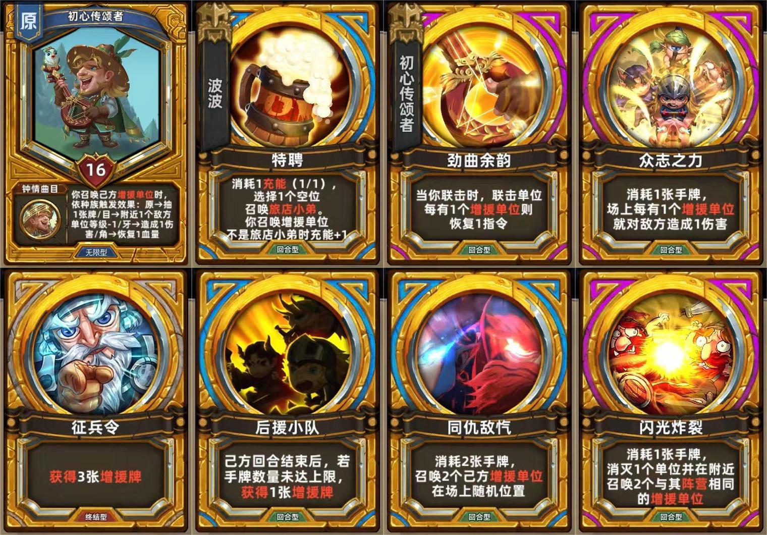 【B-初心传送者(歌手)】:中低血量。歌手 天赋很明显就是走增援流的思路,【特聘】、【助战】、【劲曲】、【众志】是增援流的核心,可以打场面也可以打直伤;【征兵】、【后援】、【同仇】、【闪光】、【幼变】是提供增援单位的配件