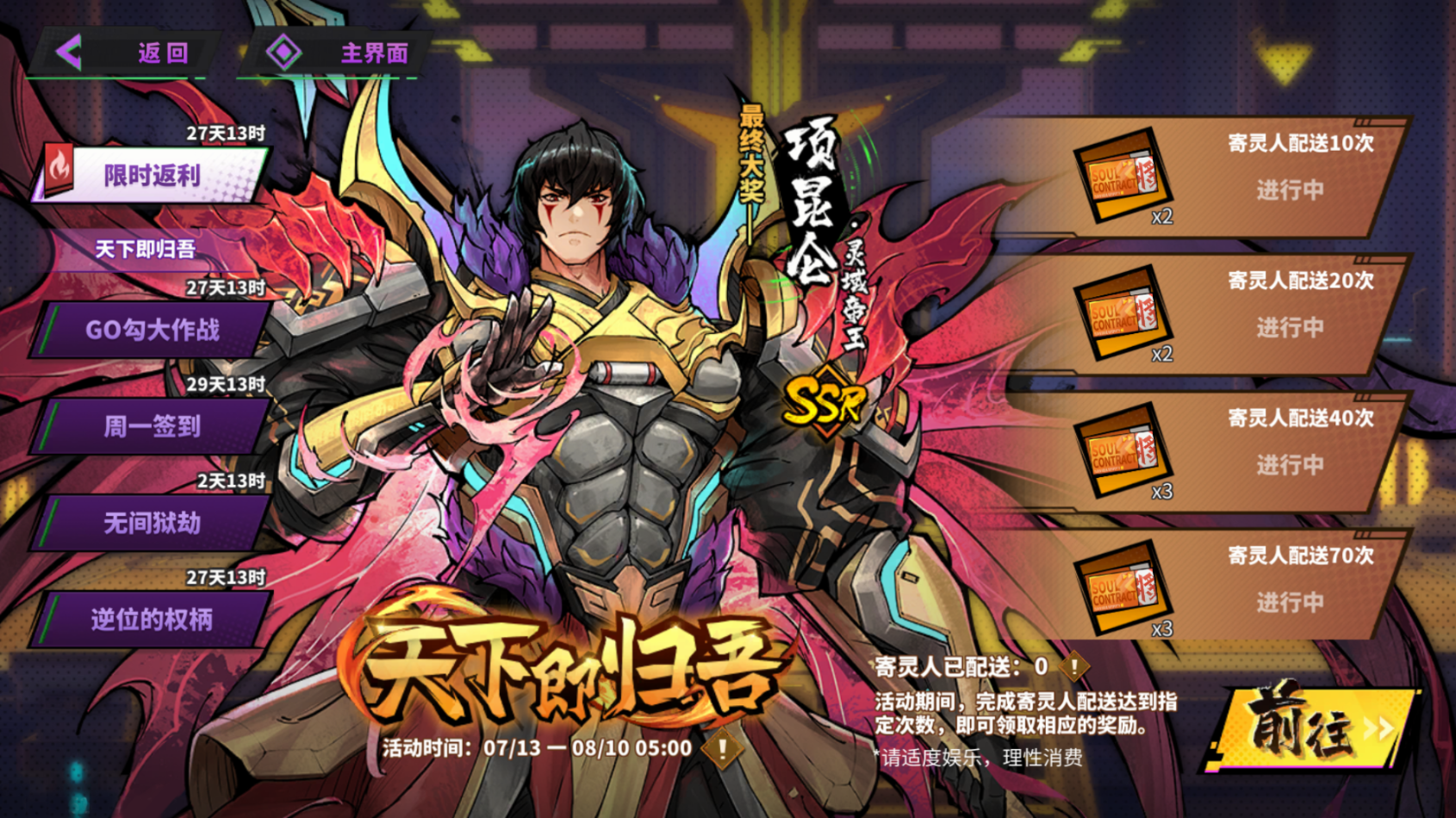 活动期间,在【君临群英】中完成一定次数的配送即可在活动界面领取【灵将契约券】等道具返利,最高可获得当期活动UP池概率提升SSR寄灵人和专属红品武器奖励。