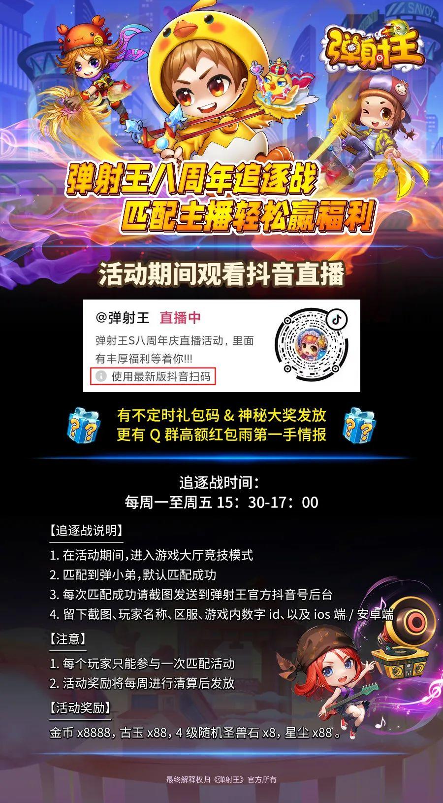 7月17日,咱们弹射王官方抖音开始试行匹配主播追逐战!和以往的魔王遭遇战不同,今年弹射王八周年,咱们以热爱八载为主题,邀请了潜力新星进行直播!