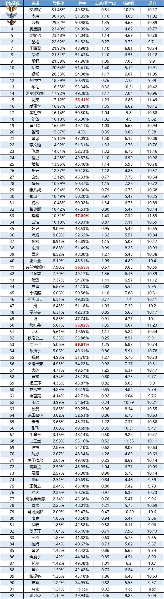 一周英雄榜单 | 鳗鳗收下全段位胜率和评分第一!