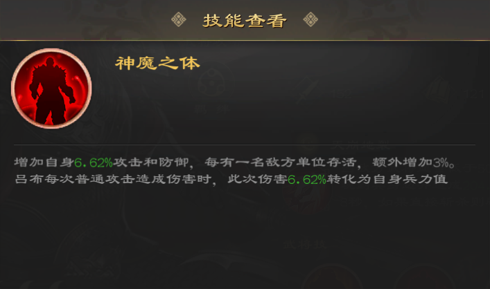 吕布增加自身6.62%攻击和防御,每有一名敌方单位存活,额外增加3%.吕布每次普通攻击造成伤害时,此次伤害6.62%转化为自身兵(该效果随技能等级提升)