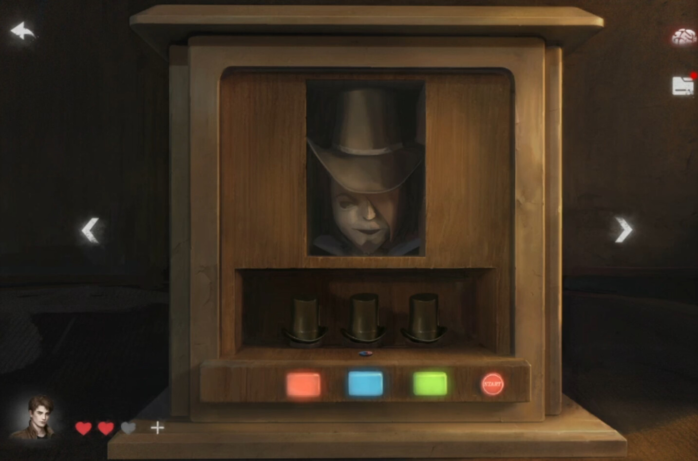 拿到小磁铁后往左边转一次就可以玩猜钥匙游戏了,点一下右下角红色按钮,上面的三个帽子会各种换来换去,不要打算拼运气乱点,直接等帽子都不动之后把小磁铁放在中间的位置,然后点中间蓝色按键就能获得钥匙了。