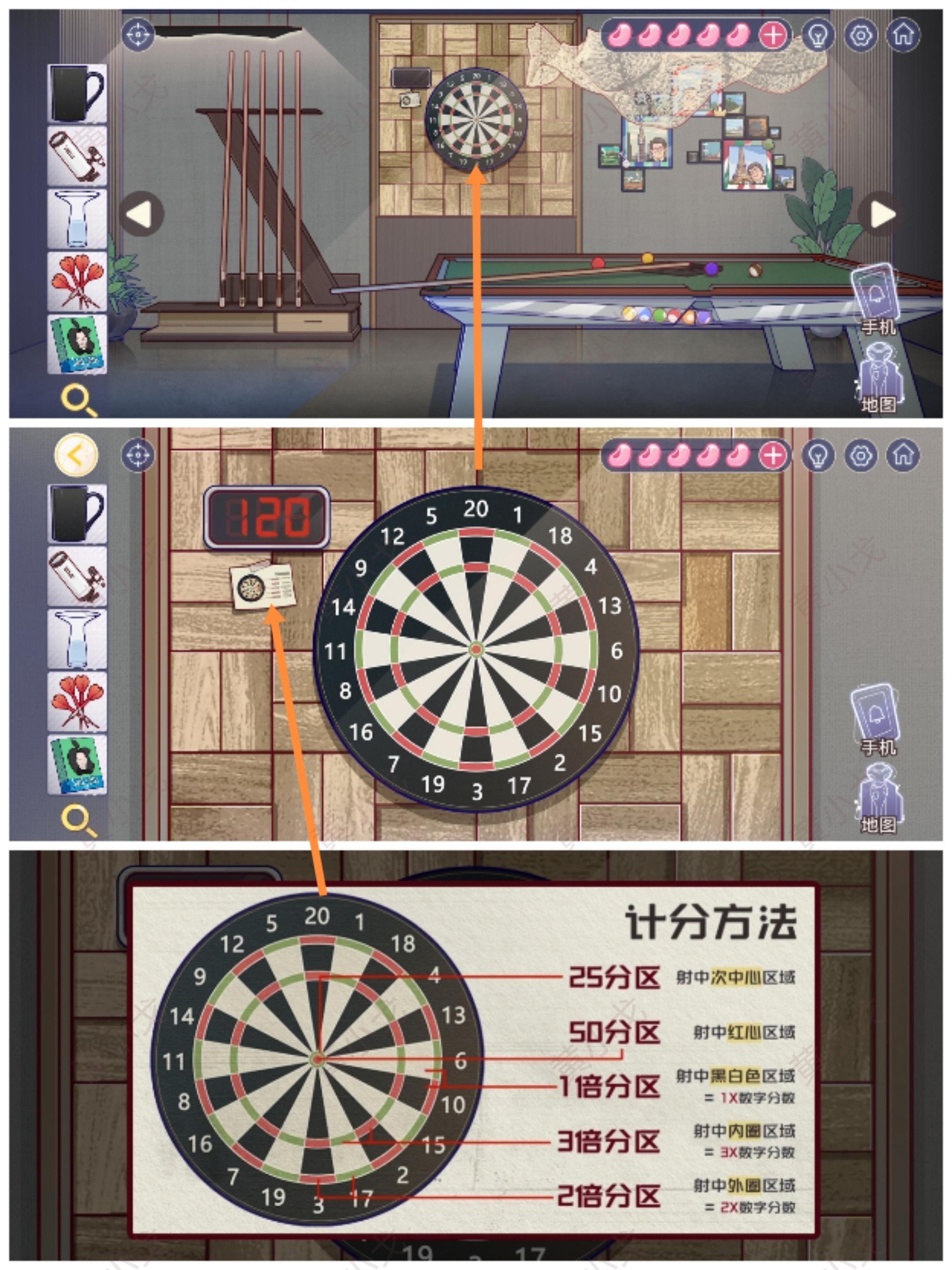 14.使用【飞镖】,完成小游戏(三次累计射中120分);暗格打开,获得【把手】