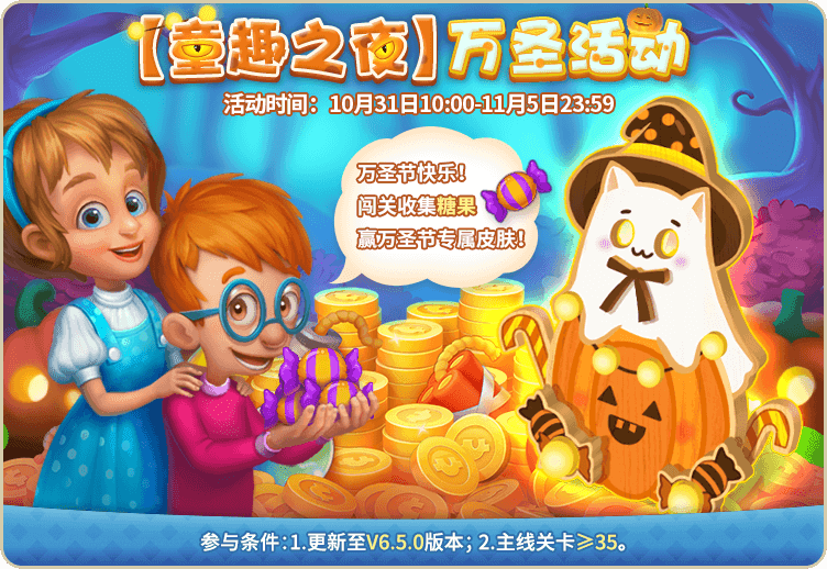 万圣节马上就要到了,这时候小朋友们会装扮成各种鬼怪挨家挨户地敲门要糖果,各位小主人们也快来加入吧,收集甜甜的糖果,不仅能获得各种道具,最终还有精美装饰“小幽灵拍照框”在等你哦,让我们一起享受童趣之夜吧!