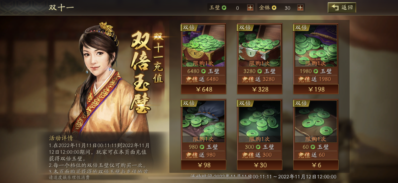 活动期间,主公可在游戏内活动界面中充值获得双倍玉璧,各档位玉璧均可充值一次。本活动内充值获得的玉璧与游戏内充值界面内的首充赠送玉璧互不影响。