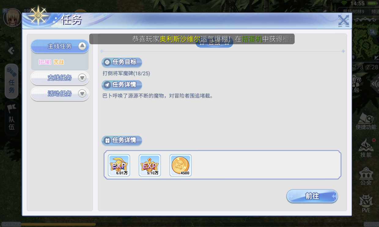 这边我们说的第一个点就是主线和支线任务,主线任务给的基础经验和职业经验都不是少数,所以能做主线一定要去做,其次就是支线任务,这个可以获取一些稀有装备,而且也会给一些经验,虽然不多,