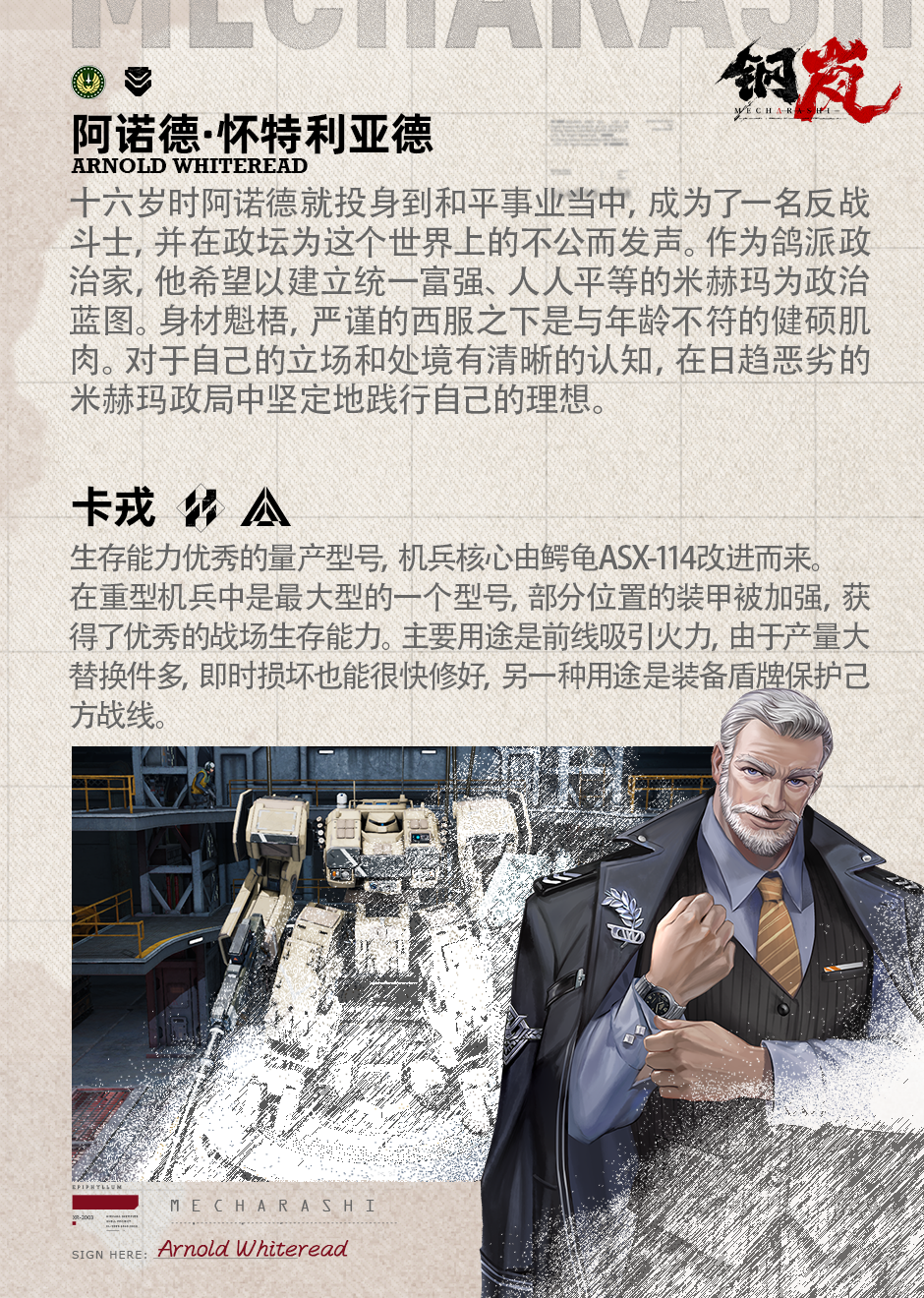 今日米赫玛日报头条惊动世界政坛,一位北陆联合议会议员出现在雷恩堡市战争纪念广场,驾驶机兵展开激情演讲,并扬言要揭露新任总督布莱尔·布吕希尔在就任后所犯下的罪行。而这位议员就是我们本期周刊的主人公「阿诺德·怀特利亚德」,这位年过半百的政客,又有着怎样的波澜人生呢?