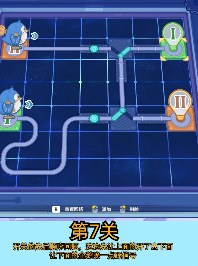 第7关攻略:这2关的思路就是让一只企鹅先走,另外一只绕点路再过来激活信号,第7关只能是下路的绕远路,不然会卡住的。