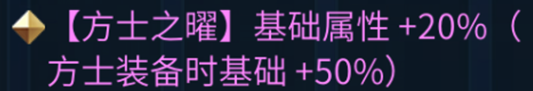 简单举例,暗器中出现了上图中的【方士之曜】,假如佩戴者不是方士,这个暗器的基础属性将得到20%的提升,假如佩戴者就是方士,那么该暗器的基础属性将达到50%的提升。
