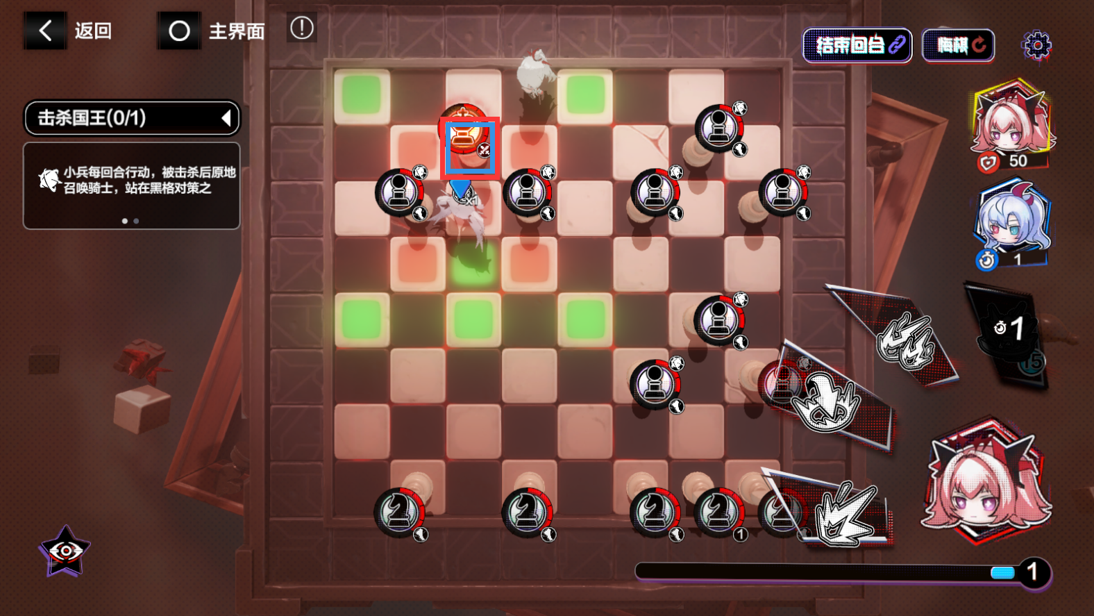 ①、右进1 ,一技能攻击右上2黑格
