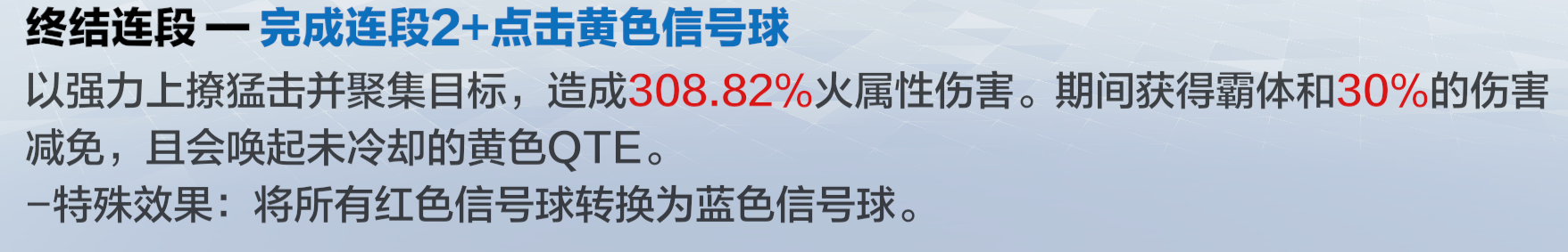 当打出黄球的连段三时,会将全部红球转化为蓝球,且激活黄色位qte。