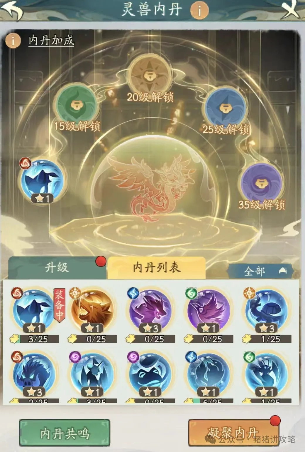 每只灵兽都是独立的内丹修炼,总共5个内丹槽位,分别在0级、15级、20级、25级、35级解锁,并且每个槽位只能携带相应的属性内丹。