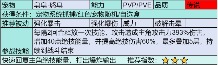 绝技宠物,唯一一只可以提供绝技能量的宠物,比较适用于PVP,可以有效提供绝技能量以及绝技伤害,搭配完美的绝技技能,可以打出很不一样的效果~,绝技能量是后面开启天赋后才拥有的,所以不建议萌新前期入手哦~