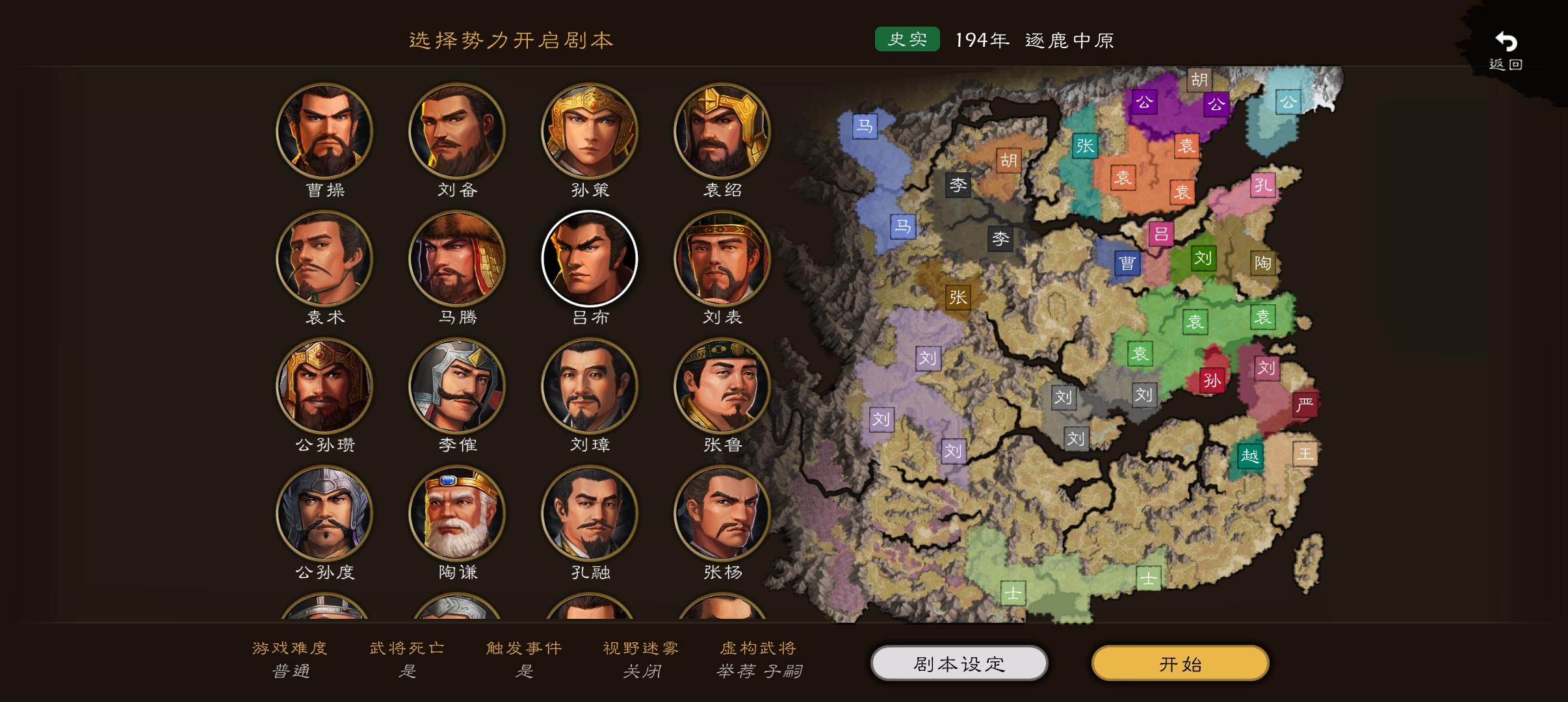 也不推荐,同样也是大片的空城,对抗性一般,没有什么风云色彩。且因为是盟友关系,势力间的争斗很尴尬。公孙度没有加入反董联军,想要公孙度轻松开局的话也可以在这个剧本直接划船南渡去江南。
