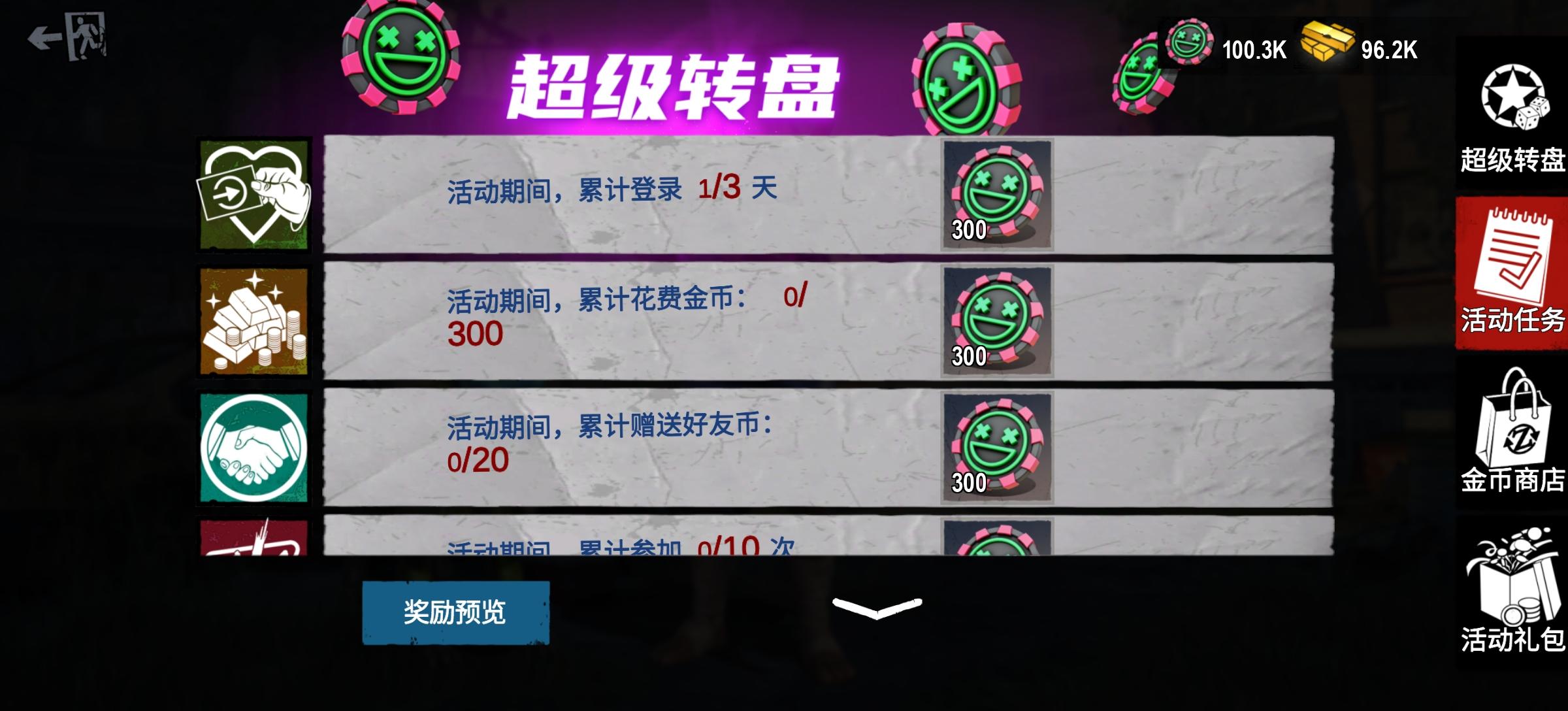 完成节日活动任务,可获得一定量转盘币,包括累计登录、花费金币、送好友币、格斗次数、消耗体力和开启盲盒任务。