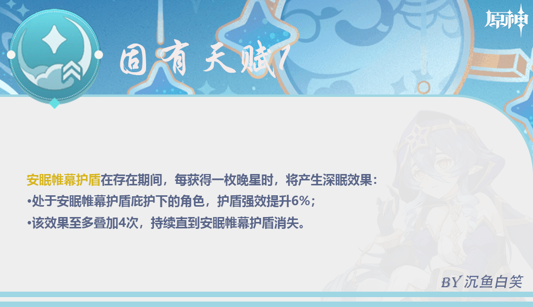 ◈增加莱依拉护盾吸收量,提升为护盾强效,属于护盾独立乘区。元素战技(E)护盾上的晚星数量为该天赋提升护盾吸收量的前提条件,只需要晚星达到四枚一次,就可以稳定获得24%的护盾强效,直到护盾消失。