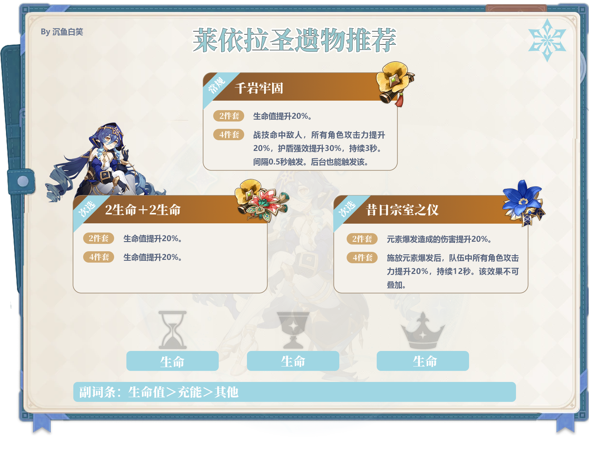 ◈一般来说莱依拉是一位完完全全的套盾角色,伤害什么的根本不需要,有盾量就行了,而莱依拉的盾量按照生命值计算,所以圣遗物的词条条件都为生命值加成,但如果你装备的圣遗物是「昔日的宗室之仪」,害怕四件套因为元素能量不足,释法不了元素爆发(Q),导致队伍攻击力提升卡手,可以考虑装备副词条为元素充能效率“时之沙”。