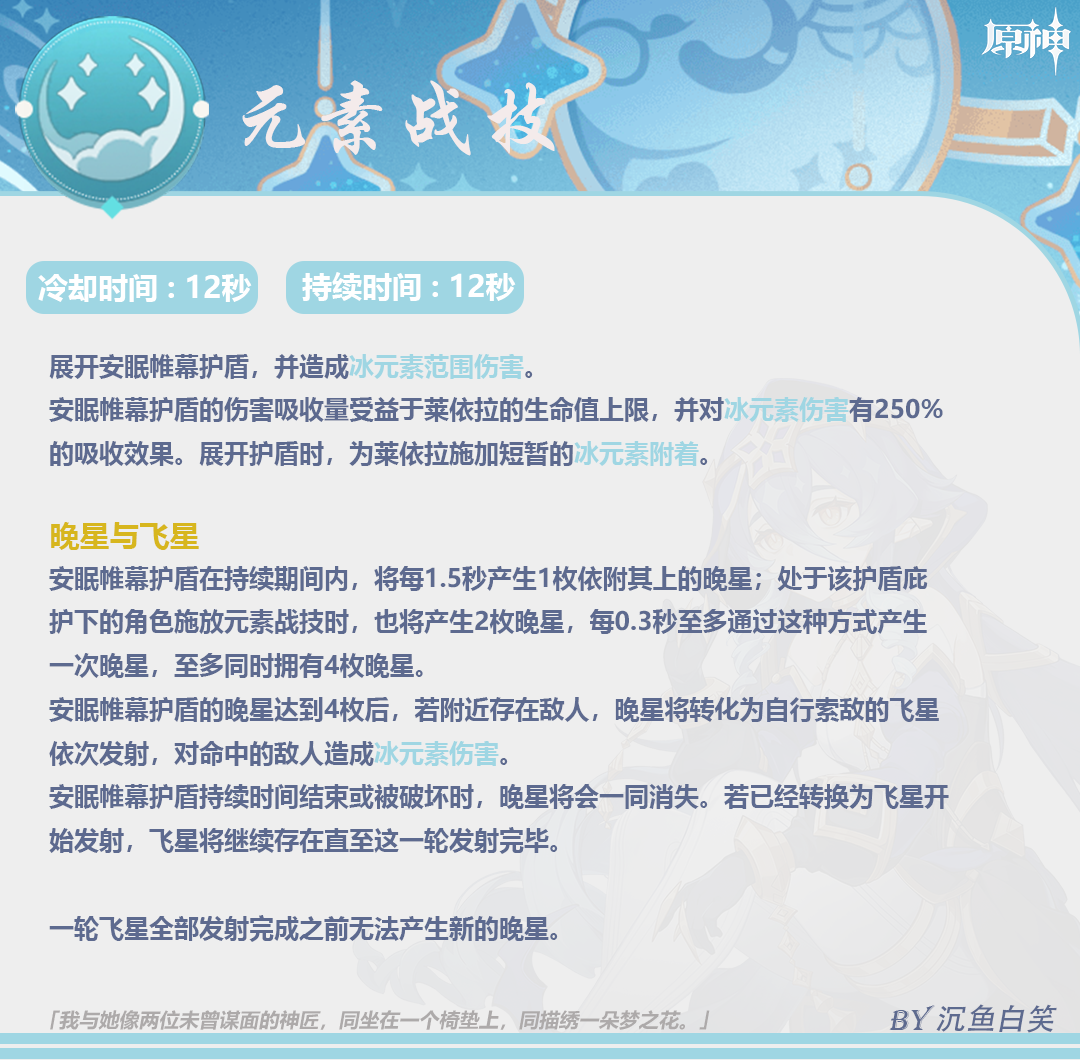 ◈护盾持续期间可以生成「晚星」,其数量达到4颗时会自动索敌,对锁定的敌人发射「飞星」造成伤害为弱冰(1点/9.5秒),且不遵循常规附着原理(3次/2.5秒),只有每次「飞星」命中敌人第一下才可以对敌人附着元素。其「飞星」造成的伤害为四段,均为独立计算互不影响,属于元素战技(E)攻击,按照莱依拉攻击力计算伤害,但莱依拉的固有天赋2(详情见下)可以根据生命值来给予「飞星」伤害提升。