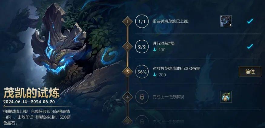攻略在手,胜利常有!下面就看各位召唤师的操作啦~截止至6月20日23:59分,加入茂凯的试炼,完成活动任务,即可获得局内表情-疼!、击败印记-树精的礼物以及蓝色晶石*500奖励!