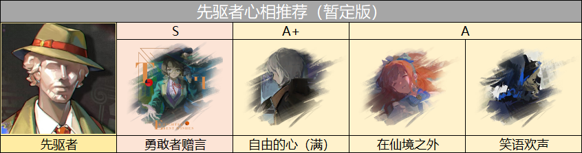 先驱者主要以抗伤辅助为主,选择足够肉的心相最好,优先选择勇敢者赠言,其次可选满增幅的自由的心。最后选择在仙境之外或笑语欢声
