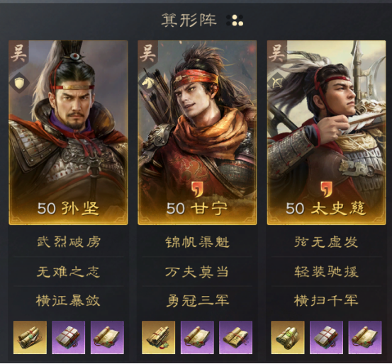 甘宁选择此阵容的话,专属韬略要选择《劫术》,这本韬略每回合有30%概率让甘宁多发动一次普攻。如果运气好发动了本次普攻,且本轮的普攻触发了连击效果的话,一回合打三次普攻后就会触发勇冠三军的额外伤害,且这三次普攻都可以通过万夫莫当将输出扩大。