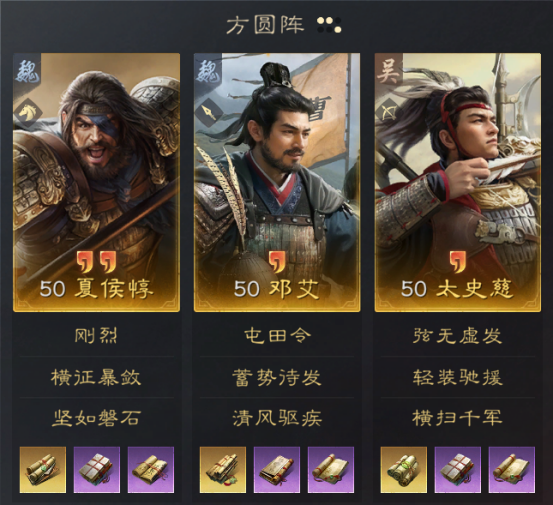 本队依靠邓艾和夏侯惇的双减伤,前期叠蓄势待发和横扫千军的层数。三回合后通过太史慈打出一定的伤害。不同于张郃后发队的是太史慈的轻装驰援会释放的非常频繁,不仅能为队伍提供减伤还提供了抵御,这个队第三回合后依然十分抗伤。
