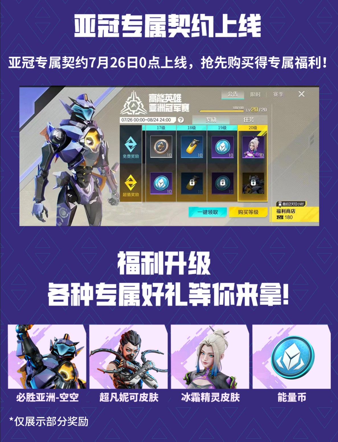 亚冠专属契约也将于7月26日0点上线,抢先购买得亚冠专属福利~【必胜亚洲空空】、【超凡妮可皮肤】、专属福利,应有尽有!超高性价比,心动不如行动,解锁就是赚到!