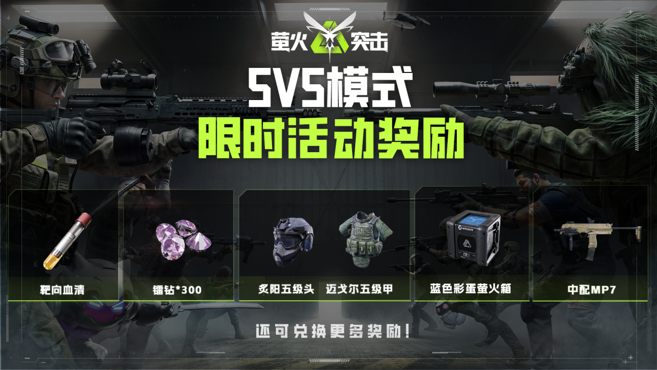 今天刚上线的5V5模式萤火虫们有没有爽玩呀~在爽玩猛冲过后,不要忘记完成任务赢豪礼啦,只要完成相应的活跃任务即可获得以下丰厚奖励。完成限时任务即可得靶向血清、蓝色彩蛋萤火箱,中配MP7,迈戈尔五级甲等丰富奖励~