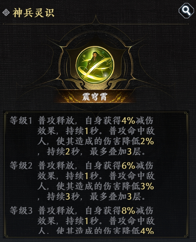 【震苍穹】的效果为:普攻释放,自身获得4%减伤效果,持续1秒。普攻命中敌人,使其造成的伤害降低。该灵识的作用偏辅助,比较适合在多人玩法中使用,可以比较好地降低敌方伤害以干扰敌人,从而保护自身和队友。