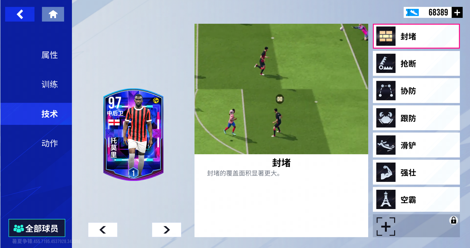 游戏场上,托莫里将防守的艺术落画绿茵。金色【封堵】技术为球队后方筑起铜墙铁壁,覆盖的范围面积更大更广,拦下“飞来横球”;高【防守意识】让他可以洞察先机,时刻盯防敌队带球球员;【抢断】【协防】【跟防】样