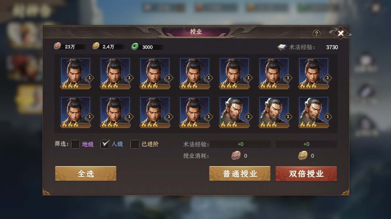 而术法升级则需要消耗对应数量的术法点,术法点可通过分解地级及人级品质的武将获得,而游戏中的“群英荟萃”卡池则可以消耗一定数量的铜贝来快速获取大量低品质的武将方便各位将军在前期获得大量术法点数。