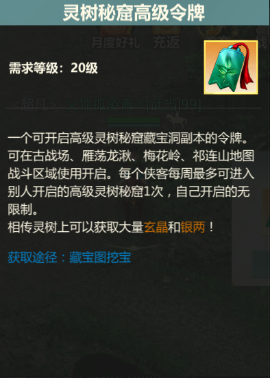 二、高级灵树秘窟维护后等级上限达到99级的服务器,将开放【高级灵树秘窟】,10个【灵树秘窟令牌】可合成1个【高级灵树秘窟令牌】,【高级灵树秘窟令牌】可开启【高级灵树秘窟】副本,完成【高级灵树秘窟】副本后可获得丰厚奖励;(具体规则详见游戏内)